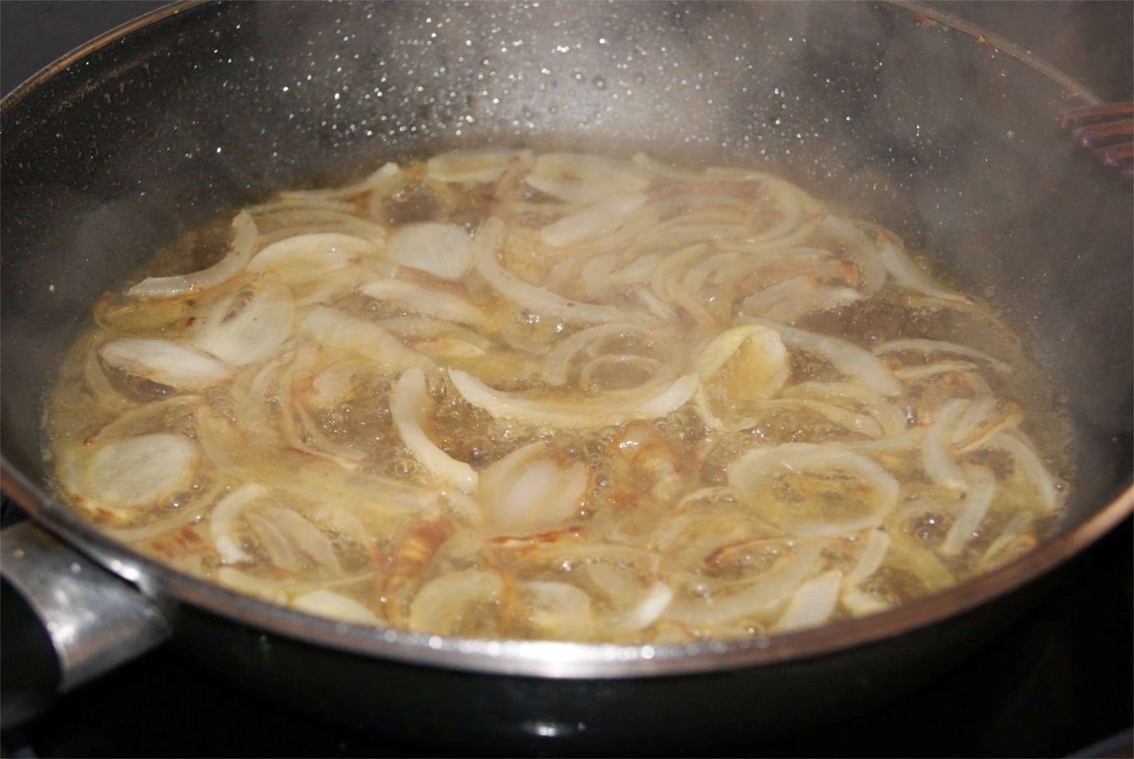 Pelar las cebollas y cortarlas en juliana fina. Salpimentar la carne y poner a calentar el aceite. Dorar un poco la carne y retirar, procurando que quede todo el aceite y el jugo en la sartén.