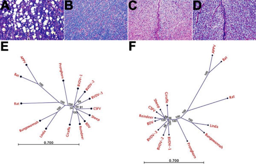 E y F) Análisis filogenético de unión de vecinos usando las secuencias de nucleótidos (E) y poliproteínas (F) del nuevo virus aislado de lechones, Provisoriamente denominado virus Linda (GenBank nº de acceso KY436034); Especies de pestivirus aprobadas BVDV-1 NADL (número de acceso M31182.1), BVDV-2 890 (número de acceso U18059.1), CSFV Alfort_187 (número de acceso X87939.1) y BDV X818 (número de acceso AF037405.1 ); Y especies tentativas virus de Bungowannah (número de registro EF100713.2), pestivirus de oveja Aydin (número de acceso NC_018713.1), pestivirus de carnero (nº de acceso NC_024018.2), pestivirus de reno (nº de acceso AF144618.2), pestivirus de jirafa (Nº de acceso NC0003678.1), BVDV-3 D32_00_HoBi (nº de acceso AB871953.1), APPV NL1 (número de acceso KX929062.1), Rhinolophus affinis pestivirus (número de acceso JQ814854.1) y pestivirus de rata noruega Nº de acceso KJ950914.1).